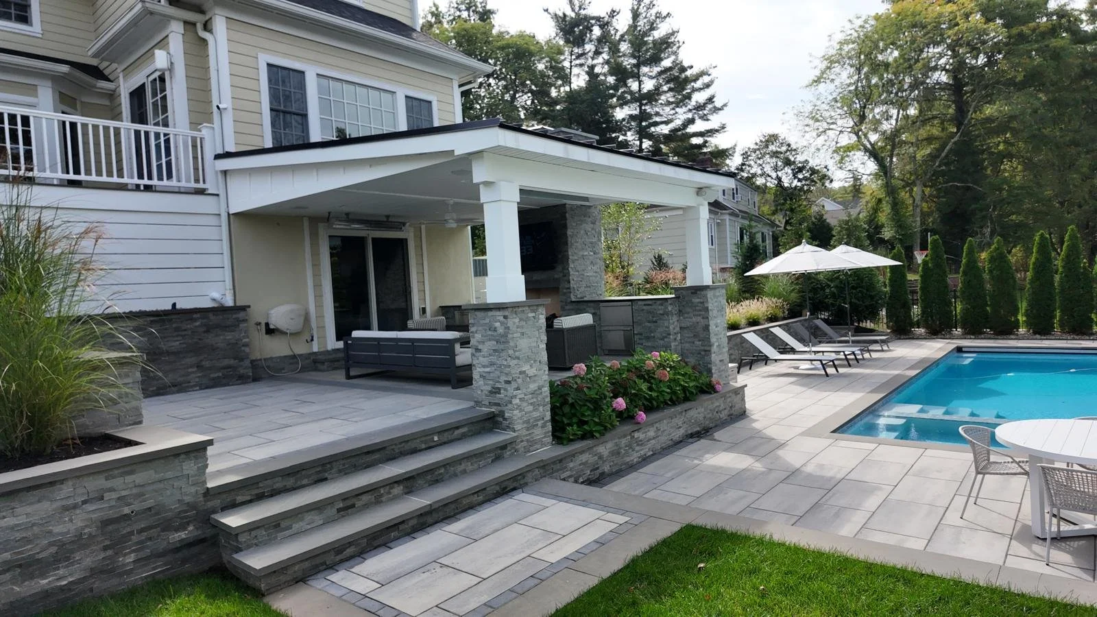 We transformed a blank yard into a wide green space with a roofed hangout area and a beautiful pool.